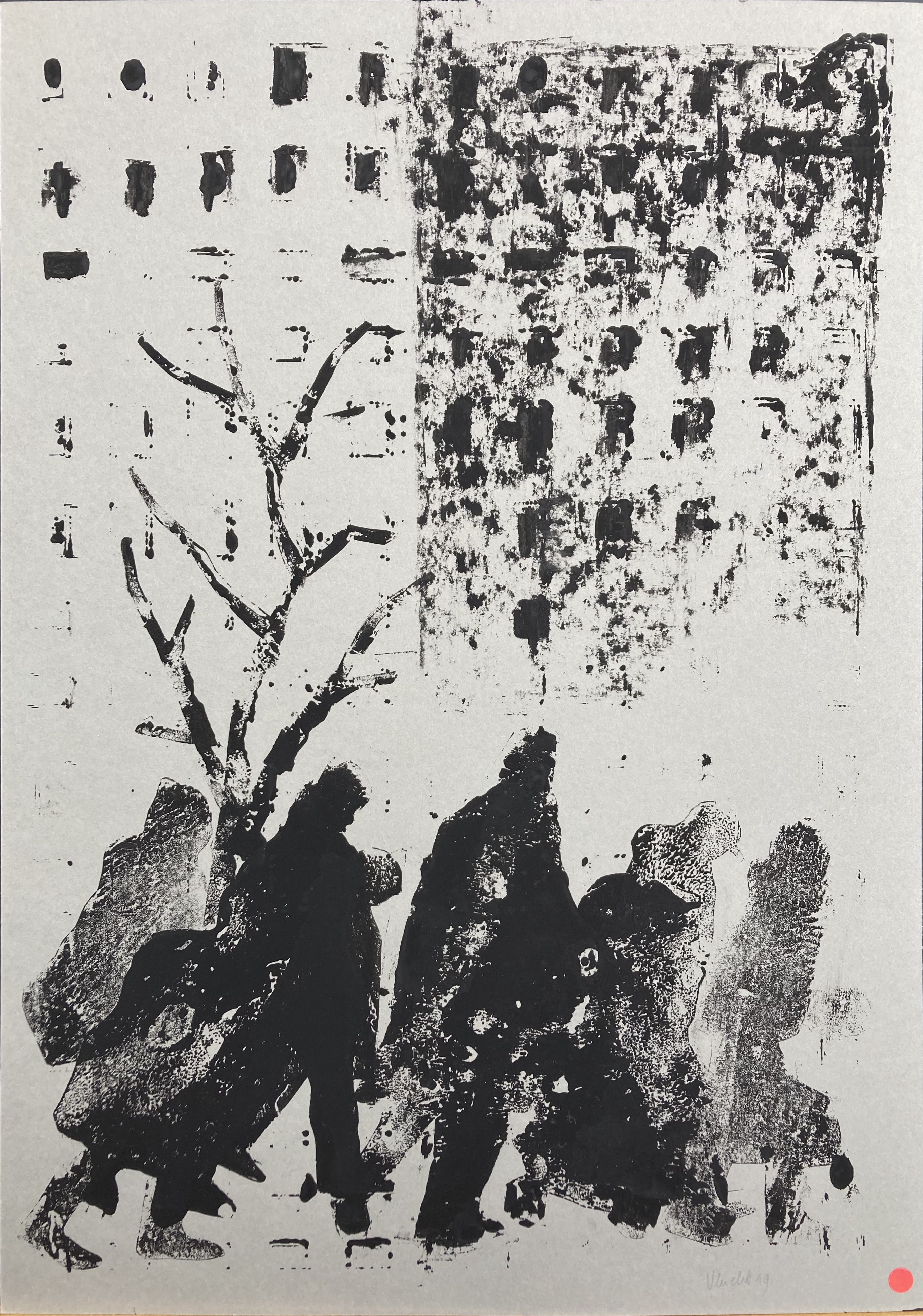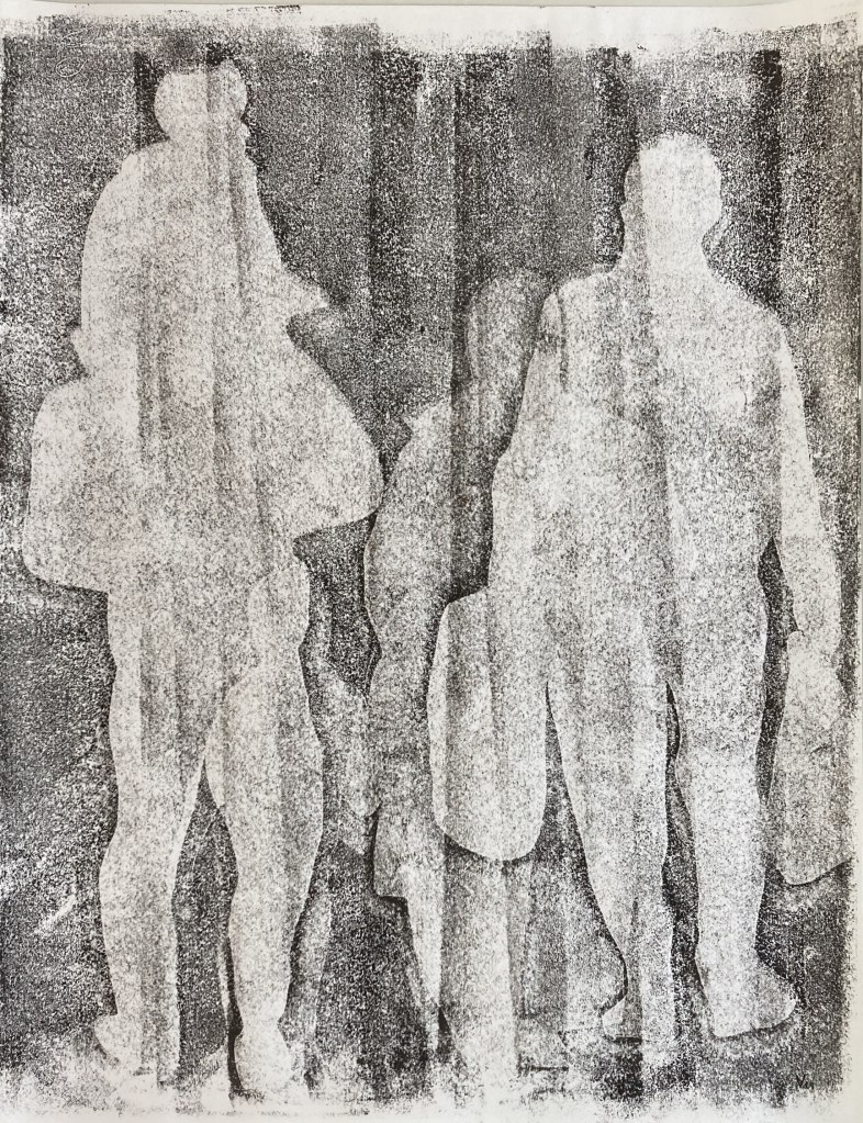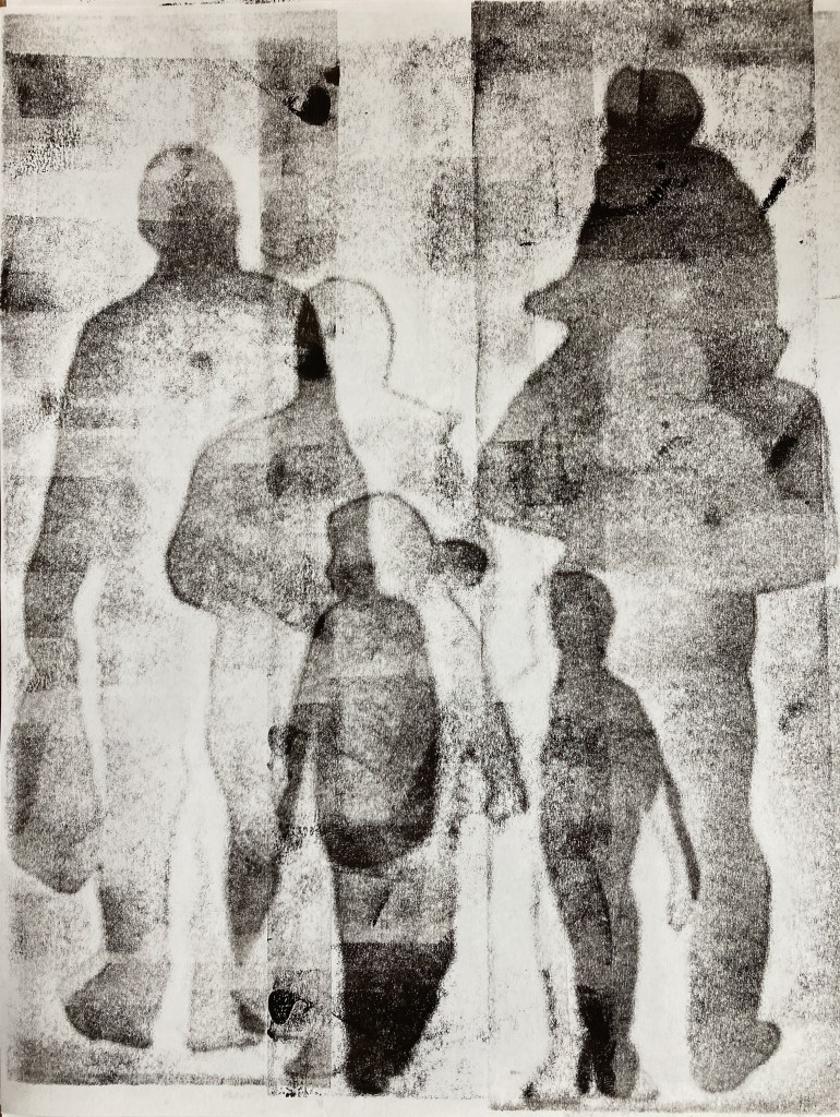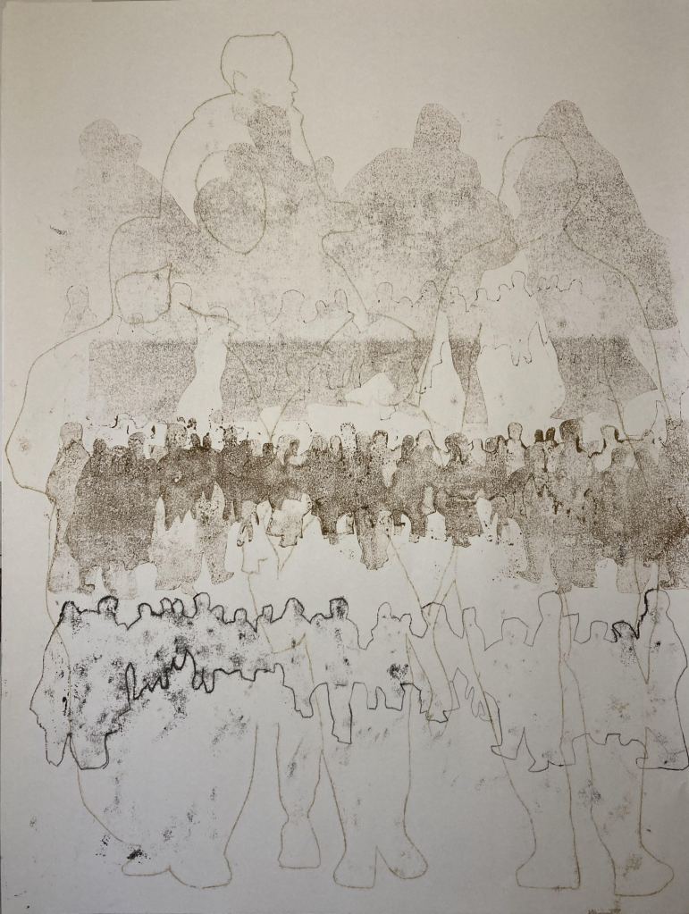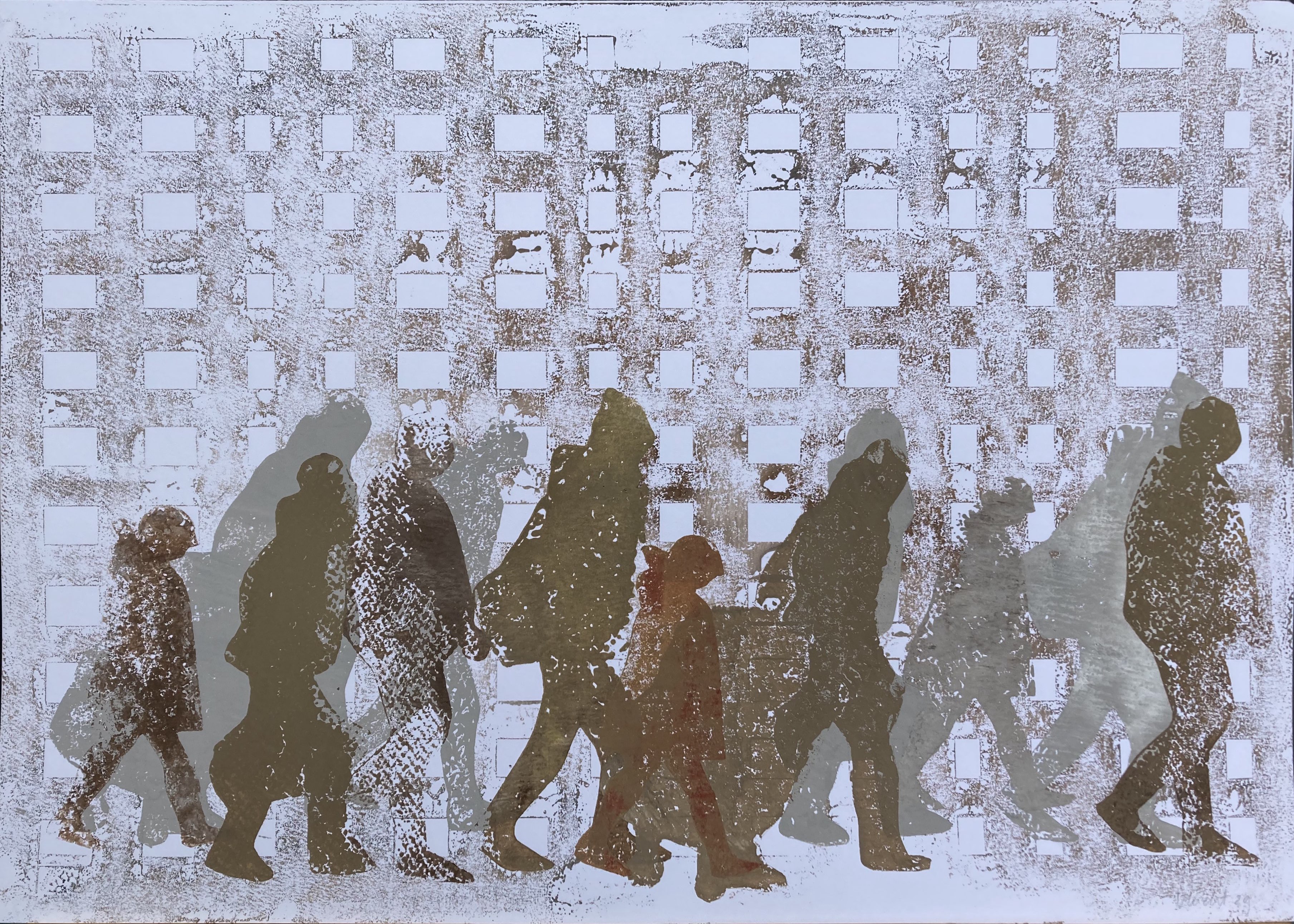 In deze serie monotypes heb ik de vluchtelingenstroom, die in Gaza aan de gang is, geprobeerd te verwerken. Hoe uitzichtloos is het verjagen van mensen, gezinnen. Op de monotype hier rechtsboven zijn per ongeluk de voeten van de mensen niet gedrukt. Dat blijkt een extra lading te hebben, alsof de mensen geen recht hebben om op de (hun) grond te staan.