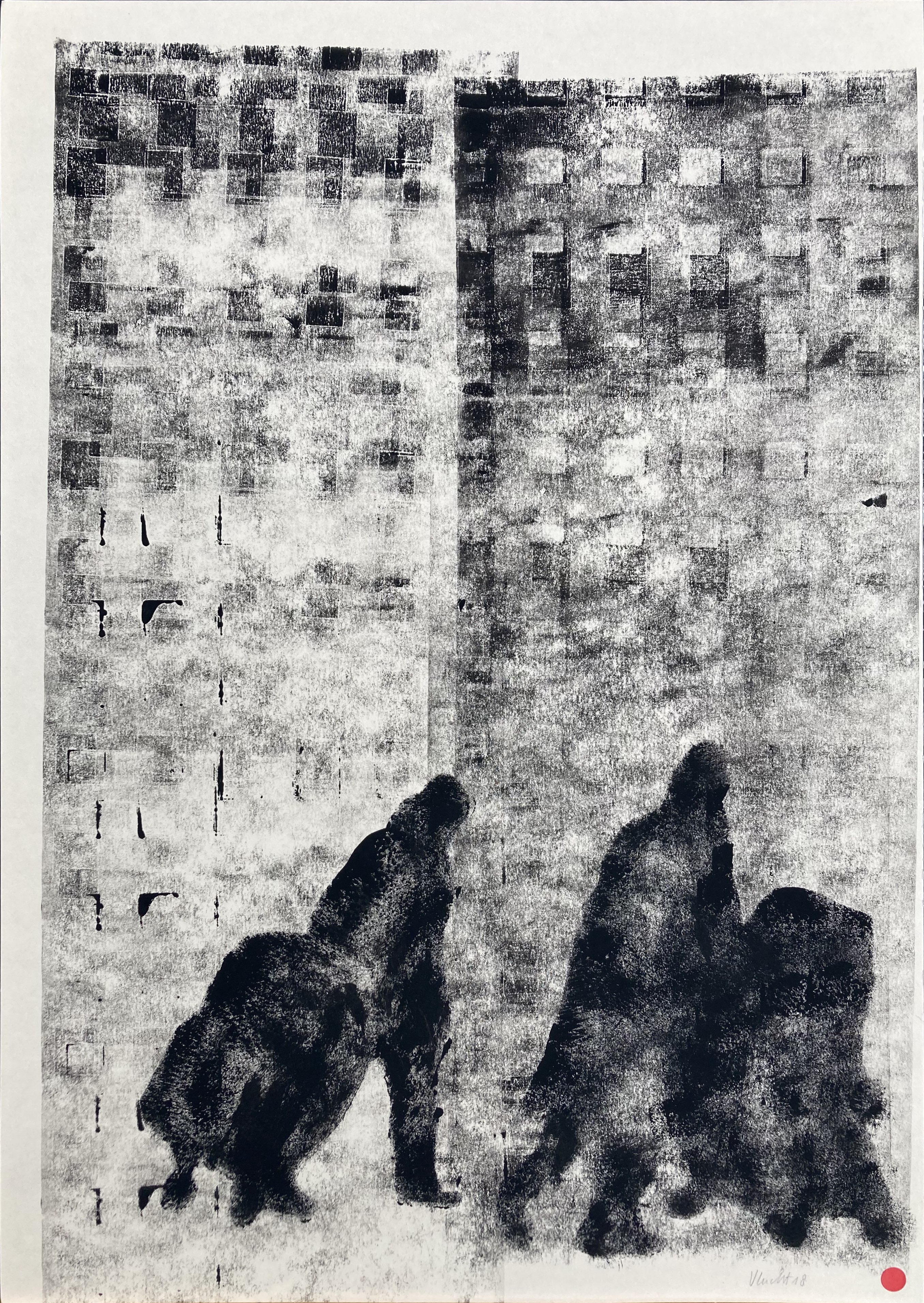 Voor het eindexamen aan de Wackersacademie in 2022 maakte ik een serie monotypes over de vluchtelingenstroom in Oekraïne. Het overhaaste en gedwongen vertrek van de mensen maakte diepe indruk op me. De silhouetten van de lopende mensen tegen een achtergrond van verwoeste Oostblok flats vragen om een grafische afbeelding.