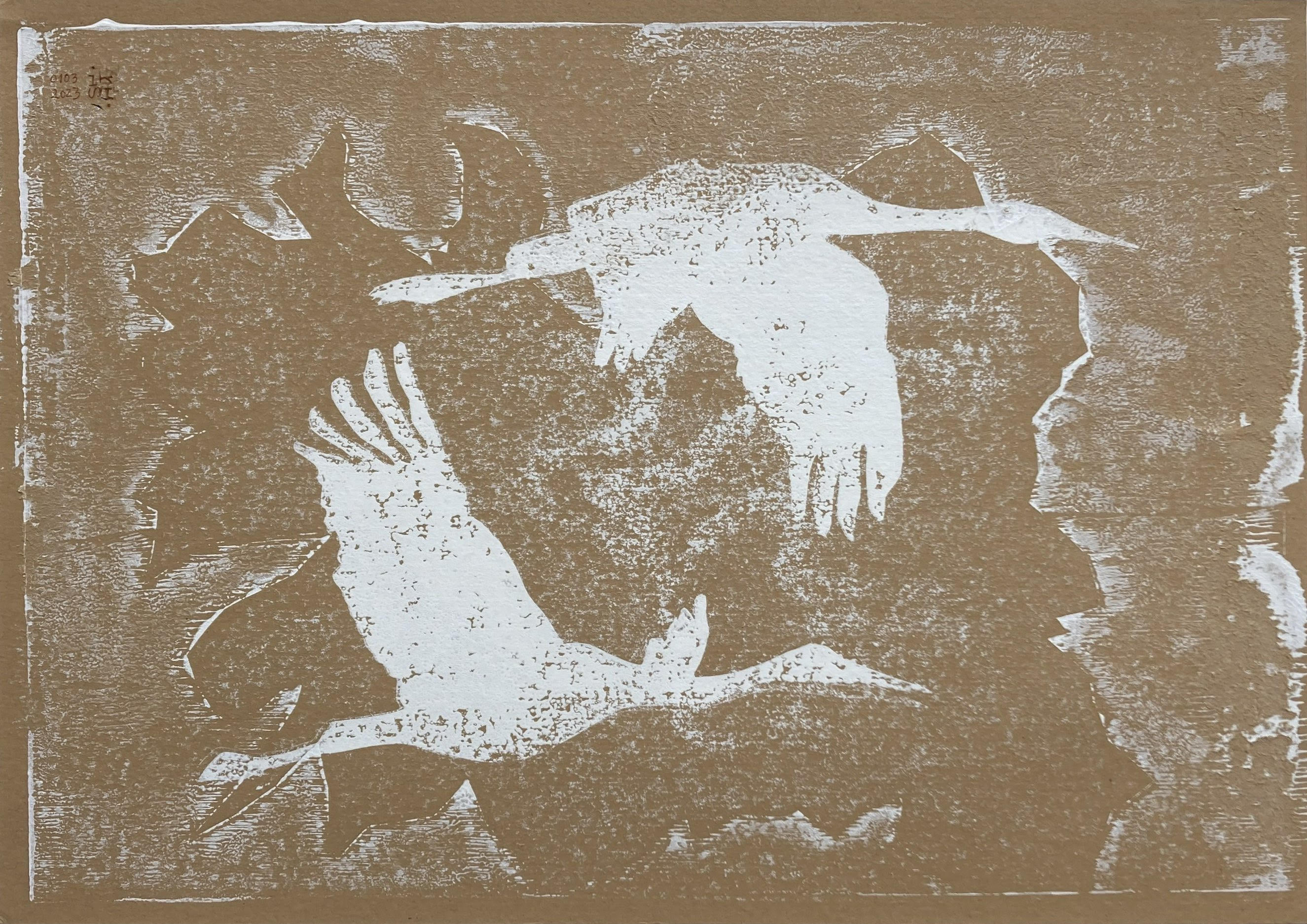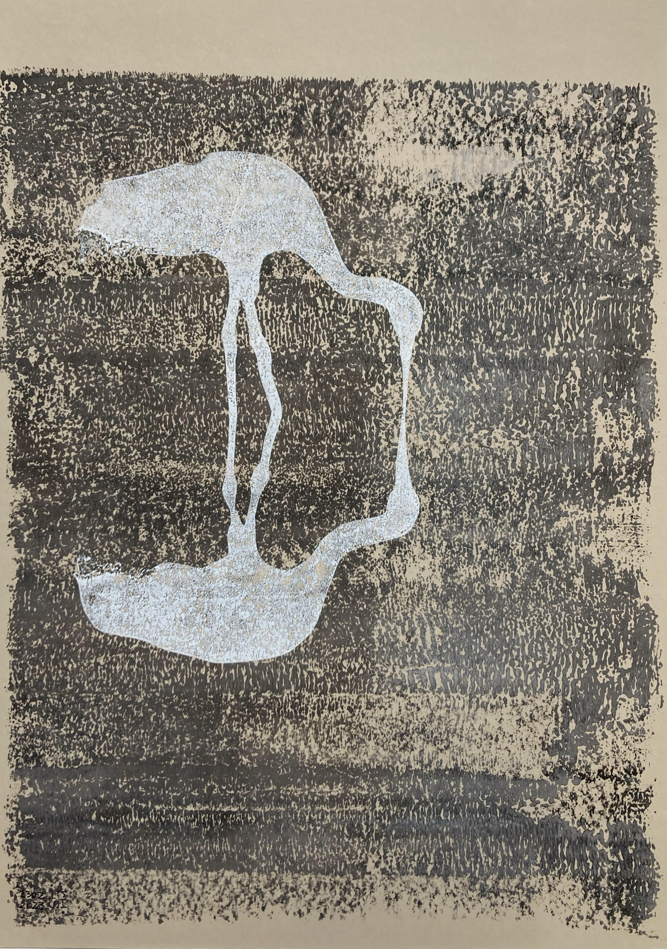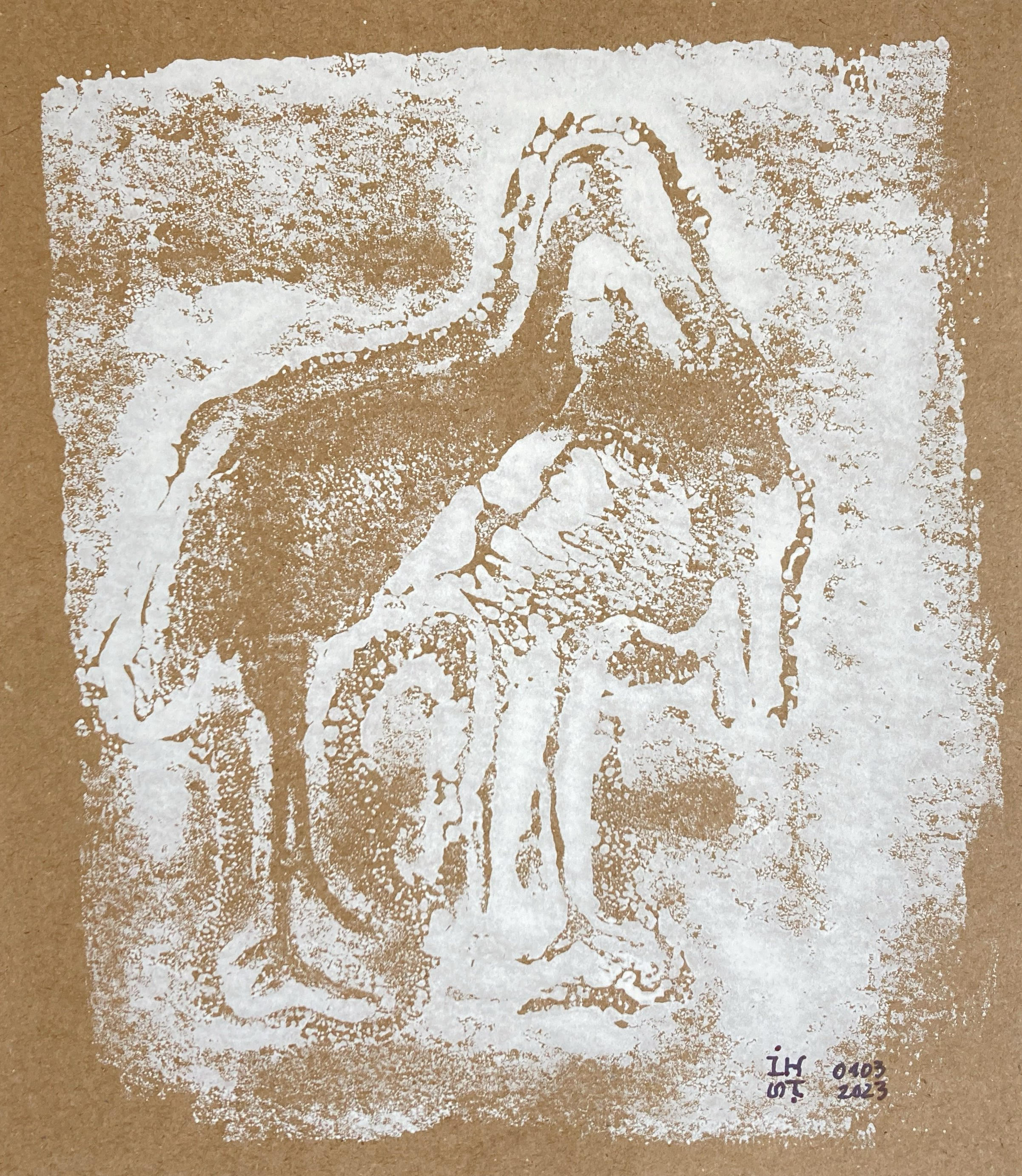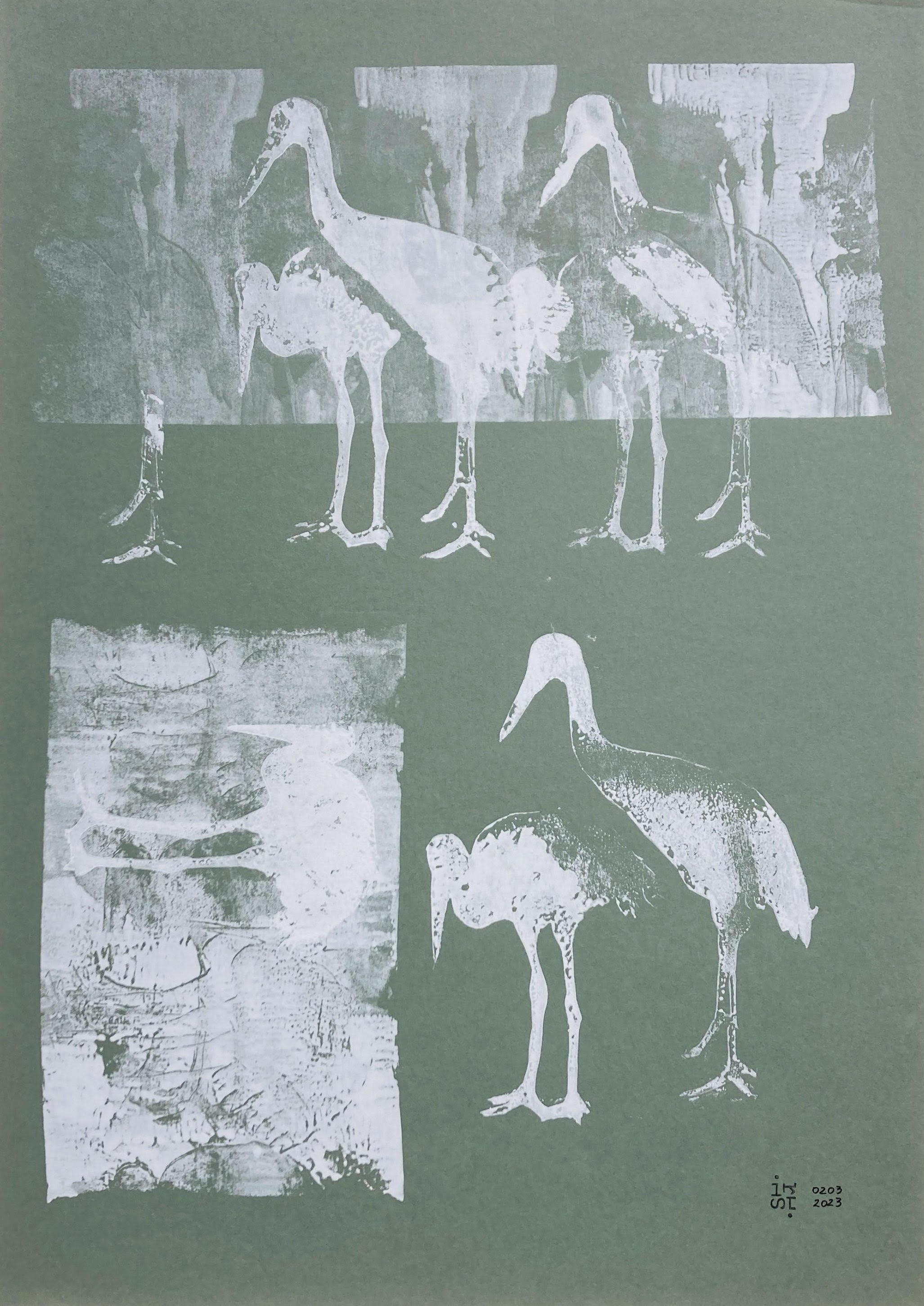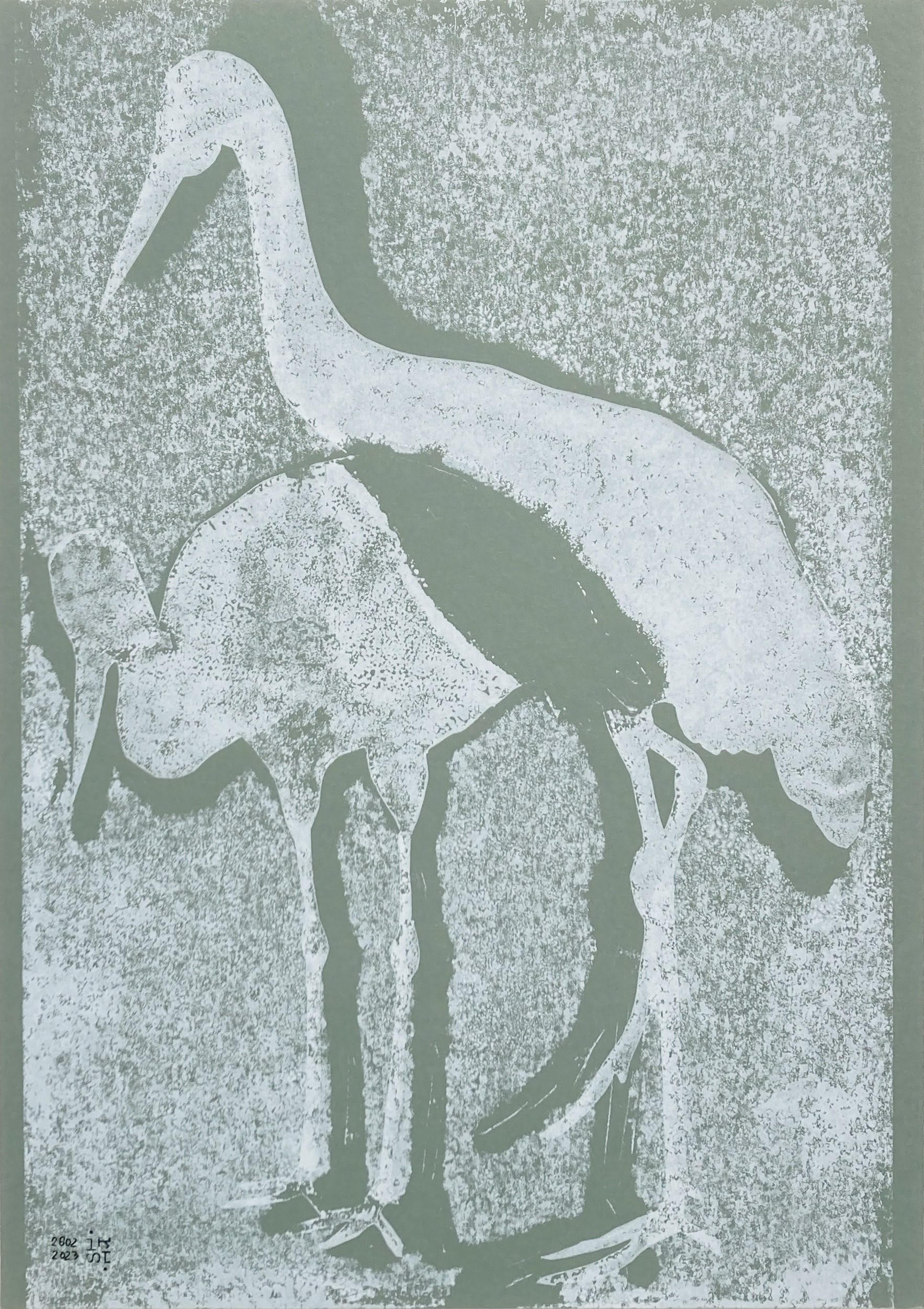 Dit verhaal inspireerde me zo, dat ik een serie monotypes van witte kraanvogels heb gemaakt.